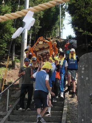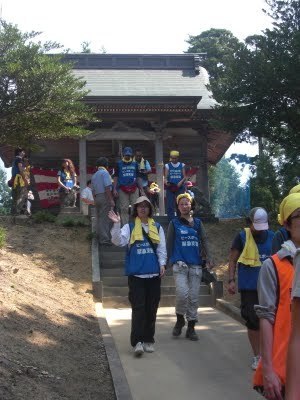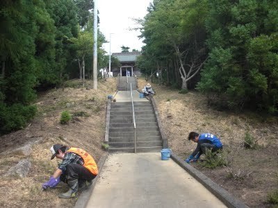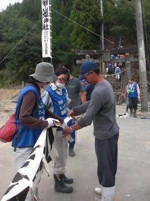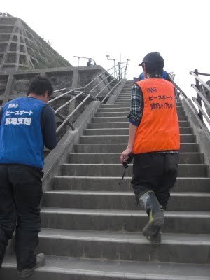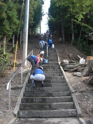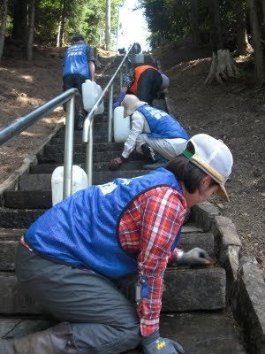 miles and miles of damaged homes The volunteer work that our team was assigned to do was all in the same location--Oginohama, a small fishing community part way out the Oshika Peninsula. The tsunami had overrun the fishing port and poured over the torii gate at the base of the shrine. Our efforts for the three days were to ready the shrine and surrounding grounds so that the locals remaining in the area could hold their important annual shrine festival. On day one, many teams worked together to clean the neglected 200 steps up to the mountaintop shrine, scrubbing away moss and mud for hours on end.