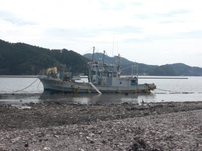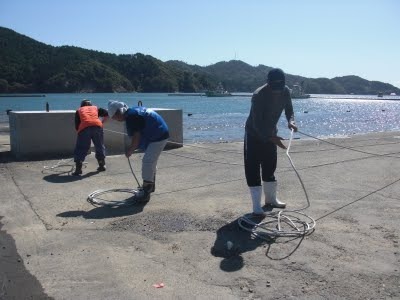 Some teams worked with the fishermen helping to cut ropes in preparation for wakame cultivation, an alternative to oyster farming which was heavily damaged and takes longer to revive. The port area had sunk about one meter; high tides now inundate the pier.