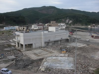 festival flags hoistedWe returned to Ishinomaki via Onagawa, one of the most dramatically and brutally hit towns along the coast. The tsunami reached 18 meters in Onagawa (60 feet), even flooding the first floor of the hospital, high on a hill. Debris in Onagawa has been mostly cleared, leaving a stark, eerie and sobering landscape.