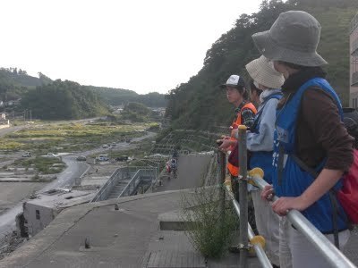 the tsunami reached the top of this buildingBack at our home base, after dinner, tsunami survivor Yoshinobu Bandai spoke to volunteers, sharing his harrowing experience of escape in Ishinomaki, his despair at hearing people's last cries for help, and the grim scenes the days after the tsunami. He implored us all to heed disaster warnings, to not hesitate in escaping to higher ground in case of tsunami, and to be wary of predicted heights of tsunami waves--in Ishinomaki the warning had been for just a six-meter wave.