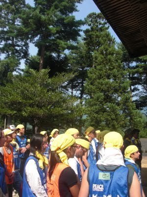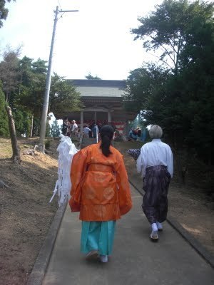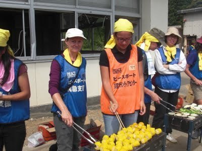 with Yoshinobu BandaiLater we watched Peace Boat's DVD of earthquake, tsunami, and volunteer efforts. On the third and final day we returned to Oginohama for the actual matsuri (festival) event. Peace Boat volunteers set up for a barbecue then joined the priest and priestess and locals climbing the 200 very clean steps to the shrine for the ceremony.