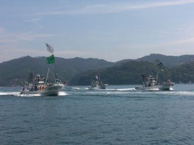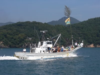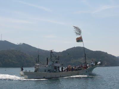 stopping at the temporary housing unitsThe mikoshi and drums, children and priest and a few volunteers went on one boat, and most of the volunteers and locals on the others, and we chugged out into the bay toward a pair of islands. The scenery was stunning and it was difficult to imagine a tsunami on that placid sea.