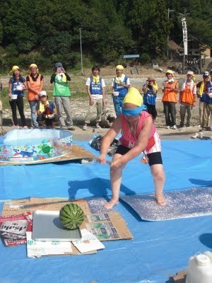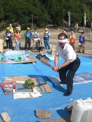 After the feast, all played Bingo and a raucous round of suika wari (blindfolded watermelon bashing) followed.