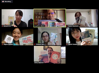 And in the last hour, translator Ginny Tapley Takemori joined our Zoom session to answer questions pre-submitted by the students about her work on The Little House and translation in general. Question topics ranged from translator research of expressions, setting and historical content; translation of dialect; the #namethetranslator hashtag; and celebrity status for translators from English to Japanese in Japan, as opposed to virtual invisibility of translators of Japanese to English in other countries. Thank you for joining us, Ginny!