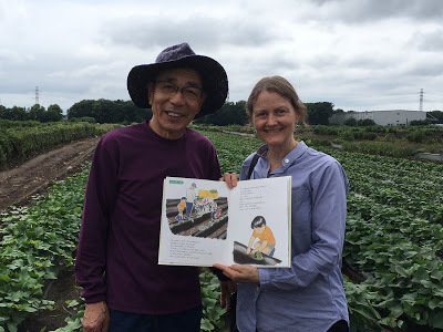 The second book おいしくなあれ富のいも(Oishiku naare tome no imo; English title Grow, Grow, Grow, Tome Sweet Potatoes!) by Hiromi Watanabe and illustrated by Hiroko Takai was actually the first book published in this reading initiative series. This book focuses on a type of sweet potato cultivated in the Kawagoe area of Saitama. During my visit to Miyoshi Town, I was able to visit the Santome Shinden fields--long rectangular land allotments created some 300 years ago combining space for farm houses, forest for leaf compost, and long fields for the sweet potatoes famous in this area. I was fortunate to meet the farmer of the story, which features a fictional grandson Daichi learning about the growing cycle and the traditional Edo-era method for creating satsuma-doko seed beds for temperature control.