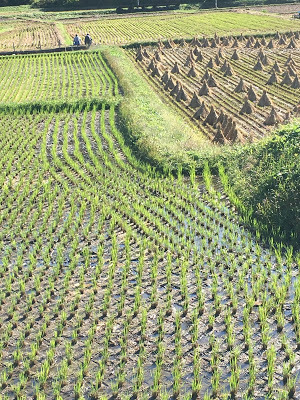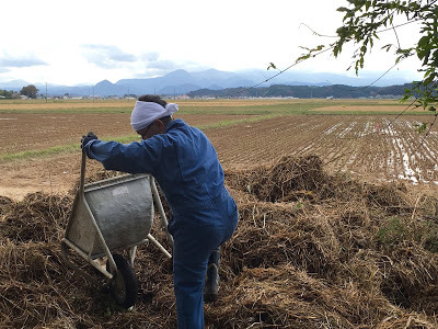 First stop was the town of Osato in Miyagi Prefecture, where my husband and I had signed up for a day of volunteer flood clean-up. We showed up with our shovels and gear, and the more than 100 volunteers--mostly from nearby towns, but a few like us from distant prefectures--were divided into groups and bussed to a farm district that had been completely inundated--a river had crested the levee. Rice straw and mud was everywhere, along with personal belongings, farm tools, and furniture. Garden harvest vegetables and fruits lay rotting, and sodden rice straw had to be carted away and dumped back into the paddies of the ruined crop. We shoveled muck, pitchforked, lugged items, salvaged little, and made enormous trash heaps.
