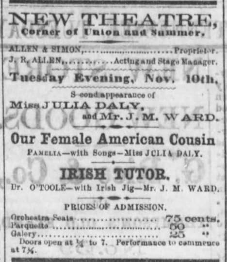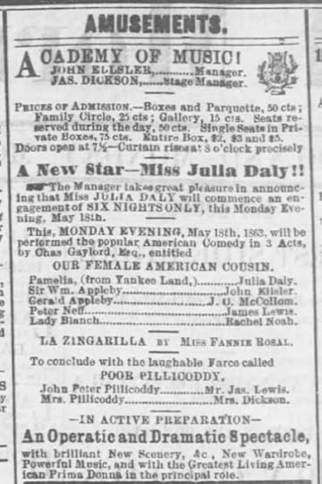 Clevelanders were eager to hearof Captain Edgarton’s novel experiences not only in the Battle of Stones Riverbut of life in “Dixie,” and he accommodated their desires by embarking on aspeaking tour. Before the war, Edgarton frequently provided oratory at theCleveland Academy of Music and he gave several talks there during this speaking tour. Itjust so happened that on Monday night, May 18, 1863, Julia Daly performed herfirst of six nights in Cleveland at the same Academy of Music, starring asPamelia in Our Female American Cousin. It was during this 6-day engagement thatI believe that Captain Edgarton and Julia met.