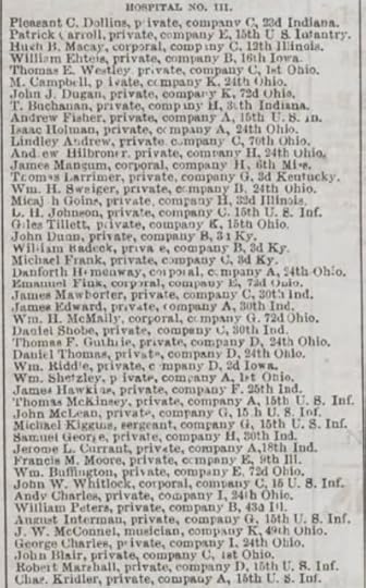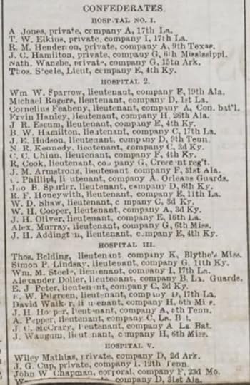 "Convalescent Iam informed means a wreck- the leavings of a body that fever, diarrhea, wounds,and army surgeons have seen fit to let remain," he continued. "Some 800 non-commissionedofficers and privates with about 40 commissioned officers make up this camp. Themen are from all parts of the army and of every branch of the service; cavalry,artillery, and infantry all mixed up together. The convalescents went under thename and style of the “Cripple Brigade.”