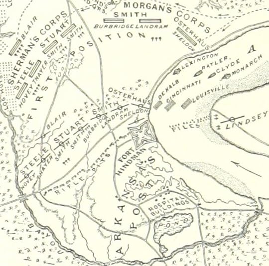 Theparticulars of the capture of Fort Hindman (named after the illustrious senatorfrom Arkansas when the Secesh seceded from the halls of Congress) are about asfollows. We arrived before the fort about dusk on Saturday the 10thinstant, and the artillery, cavalry, and infantry were immediately ordered todebark and form in line of battle around the entire fort and rifle pits, thisline being about two miles long. The enclosure formed by the rifle pitscontained, I should judge, about 200 acres. The fort was on the extreme leftand lower corner of the area. The works were built on a bend of the river, thebend being convex from the land; the rifle pits extended from the river at thefort out into the woods and around to the river above. Distance was half a milefrom the starting point by water and as I said before, two miles around by thepits.