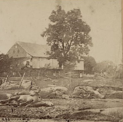 "The 9thOhio and 87th Indiana charged across the field in front, the 35thOhio passed on and we, according to orders, caught up the rear. At the edge ofthe woods in front we halted and were again ordered to lie down. Here we werein exact range of a Rebel battery but a few rods in advance in the road. Theypoured in grape and canister and here Ambrose Palmer was killed; he was struckin the side and scarcely moved except to slightly raise one hand which hedropped very quietly by his side," he wrote.