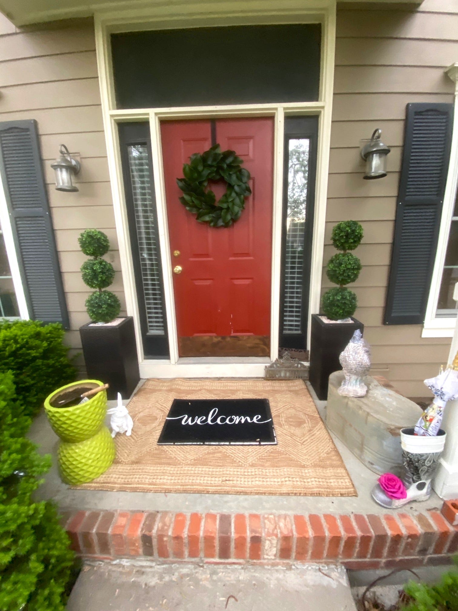 The welcome mat and carpetI wanted a carpet that withstood outdoor elements but still looked pretty, so I chose this jute rug. The 3x5 size fit perfectly, and I just paired it with a standard black and white “welcome” mat. You can find one here.