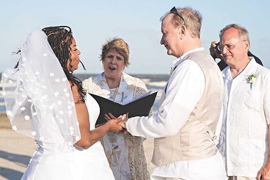 Yvette and Tim on the beach, with wedding officiant Wendy Meyer.The Living God changed me and what, and who, I sought. In his vows, Tim told me: