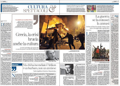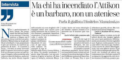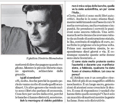 Δημοσιεύτηκε σήμερα (20-03-2012) μια συνένετευξή μου στην ιταλική εφημερίδα La Stampa. Αναφέρομαι στην κρίση και κατά πόσο επηρέασε το εκδοτικό και συγγραφικό περιβάλλον, αλλά και για το κάψιμο του σινεμά Αττικόν, τις κλοπές στο Αρχαιολογικό μουσείο της Αρχαίας Ολυμπίας και την Εθνική Πινακοθήκη όσο και για το αστυνομικό μυθιστόρημα...