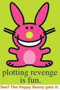 I’m not going to sit here playing coy, pretending that I’m one of those people who doesn’t believe in revenge. Oh, I do. I so do. Generally, I just prefer to leave revenge to God, and that’s only because I think that if I try to execute balance on my own, I’ll either fall shy of what’s truly deserved or I’ll overshoot the mark and bring on some newly deserved nasty on my own head. I keep my paws clean because I think God will eventually nail evil people harder than I ever could.