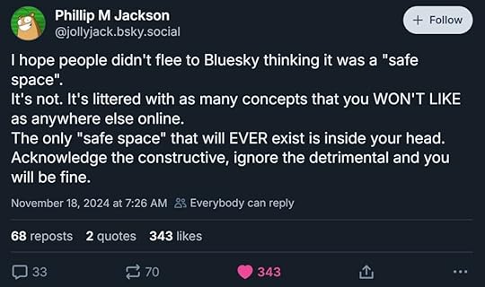 I hope people didn’t flee to Bluesky thinking it was a “safe space”. It’s not. It’s littered with as many concepts that you WON’T LIKE as anywhere else online. The only “safe space” that will EVER exist is inside your head. Acknowledge the constructive, ignore the detrimental and you will be fine.