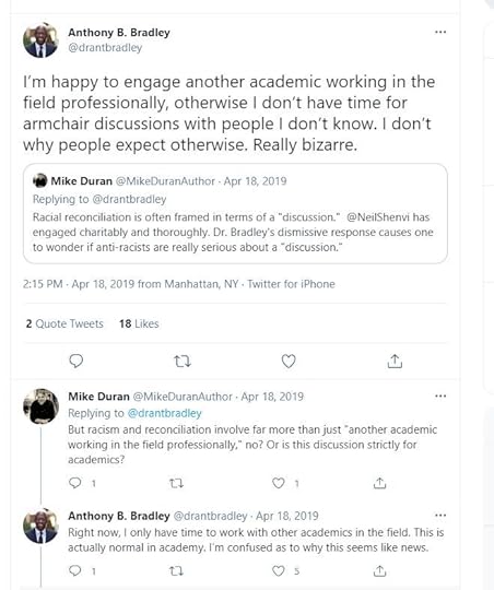 So because I was not “another academic working in the field,” such conversations were merely “armchair discussions” which Bradley didn’t have time to engage in. He had the time to publicly post to over 39,000 followers, but not the time to engage one. Well, that was our only exchange. The next day I discovered that Dr. Bradley had blocked me.