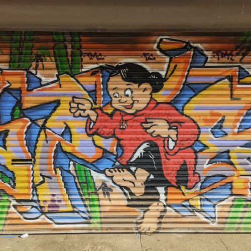 Clement St shutter mural reads “protect your poh-poh and gong gong”