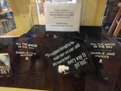 The All the Birds in the Sky T-Shirt is for sale at the amazing Borderlands Books! (Photo by Annalee Newitz)