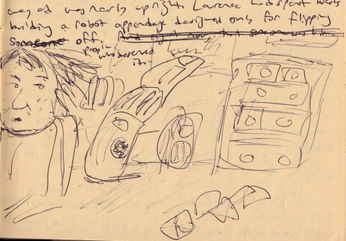 Unfortunately, Laurence gets bullied a lot—this is a doodle of Laurence getting shoved into a dumpster, from the first draft of All the Birds in the Sky, which I wrote in longhand. Laurence is constantly getting harassed by the other kids at his school, and meanwhile his parents are convinced that if he just stays indoors doing geeky stuff all the time, he’ll turn into an antisocial misfit like his Uncle Davis.