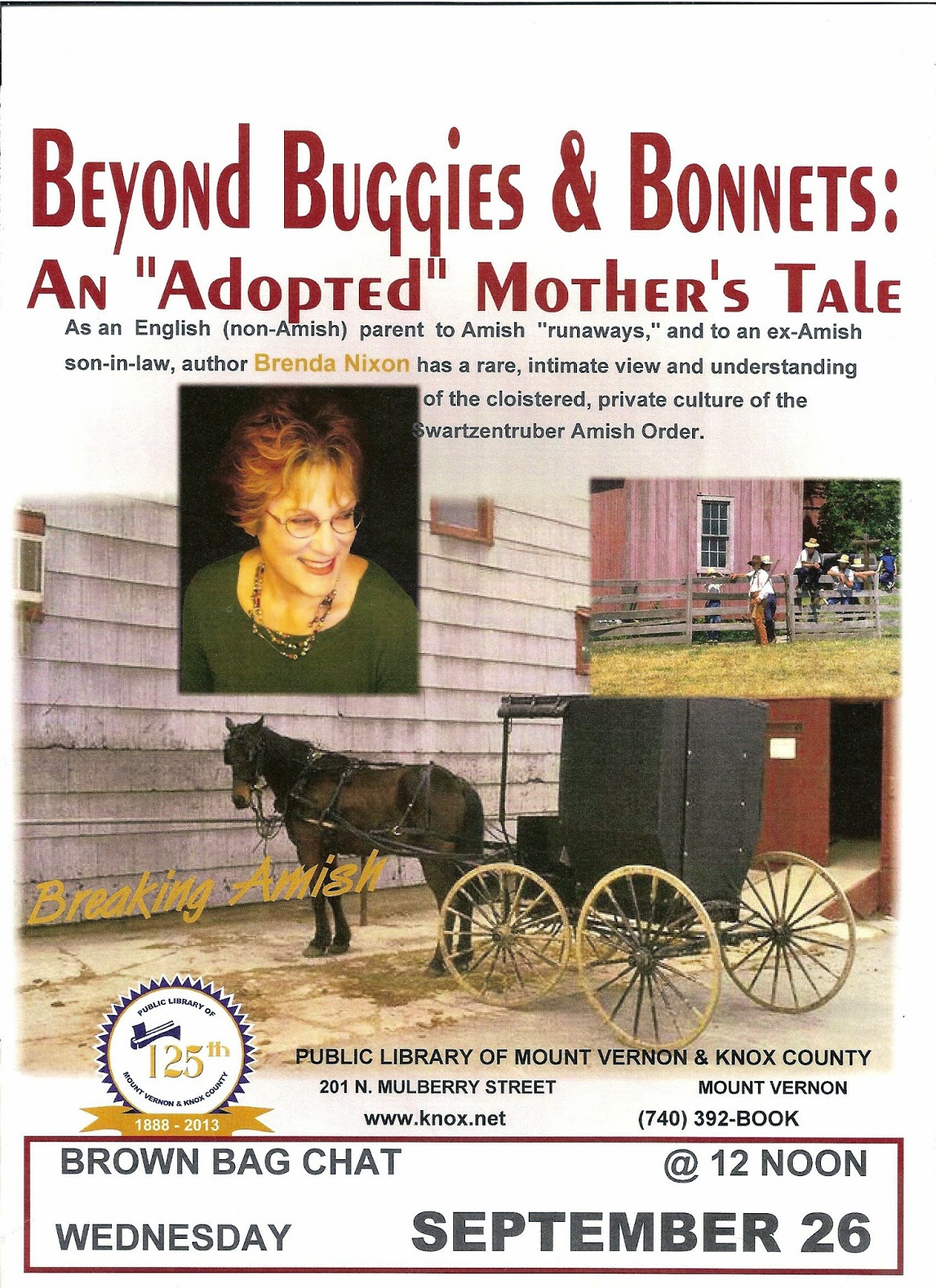 She'd wanted me to speak during her library's Brown Bag Chat - noon program - about my life with Amish and those who've gone beyond their buggies & bonnets.