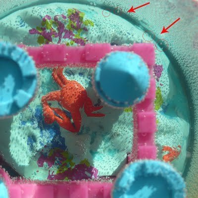 And just twenty-four hours later, we have sea monkeys!Viewed through a magnifying glass, the Magic Castle is fairly teeming with life; but with my rudimentary camera, I face some serious technical limitations in photographing the tiny critters until they really start growing.