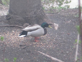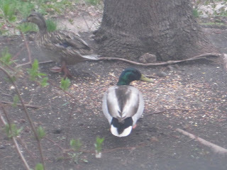 This morning I woke up to some unusual visitors to the front yard. (Sorry the picture is bit blurry, but I was taking it through my window in order not to disturb Mr. Drake Mallard, though he clearly is eyeing me suspiciously anyway.)