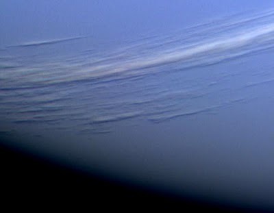 Two hours before closest approach to Neptune in 1989, the Voyager 2 robot spacecraft snapped this picture. Clearly visible for the first time were long light-colored cirrus-type clouds floating high in Neptune's atmosphere. Shadows of these clouds can even be seen on lower cloud decks. Most of Neptune's atmosphere is made of hydrogen and helium, which is invisible. Neptune's blue color therefore comes from smaller amounts of atmospheric methane, which preferentially absorbs red light...