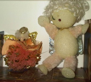 I tried not to run to the booth because part of flea market buying is not to appear over anxious so we can get the item for an even better price. When I reached the table, I looked at what was there first to appear like I was shopping in a nonchalant fashion. Then, I bent down and saw the box. There my little friend lay on top. Again, I kept my cool and picked up the box. I set aside one, two, three items like I was considering purchasing them. Lastly, I removed the one I really desired–a Styrofoam angel with glittery silver wings, curly white hair, and sequin eyes and mouth.