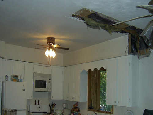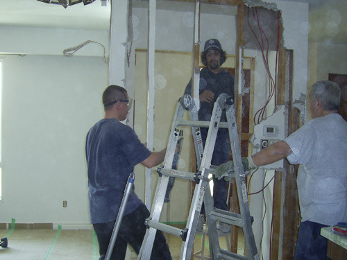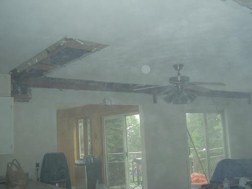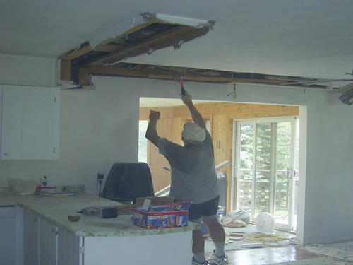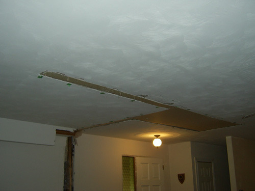 So now, since it’s time to get the ceiling fixed, I might as well get rid of the ugly bulkheads as well as a section of ceiling that used to have kitchen cabinets hanging from it when the house was first built back in the 70′s. There was a name for that style kitchen but I don’t remember it.