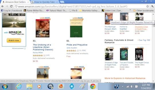 …So this brings me to my picture. Yes, there is such a thing as Amazon Best Sellers Sales Rank and it updates every hour for books below 10,000. You want your number to be small by the way. And if you get into a low enough ranking for your genre category you get on the Top 100 List. So yesterday I had a look (I really look like every hour now) and The Undoing of a Libertine was number 83 on the paid Top 100 Paid List and Austen’s Pride and Prejudice was right beside it on the Top 100 Free List. It was so pretty I could not resist the screen shot. My book sitting on a bestseller list right beside hers. Kinda surreal for me. So here you go.