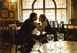 It’s the eve of Rom Con and as I scurry around getting my swag into the suitcase, my clothes organized, and my kindle packed, I find myself thinking about the next story. The excitement of going to another professional conference and mingling with fabulous authors I read and adore has rejuvenated my creative spark. So it’s time to get down and dirty with the next book. Loosely titled, Unveiling June, it is about a painting, the back story being told in two parts, by two couples–one from 1812 and the other from 2012. It’s funny how the smallest things can motivate a person. I saw this painting and it did just that. This is how I picture my modern couple in my head–in this spot-on work by Rob Hefferan. Art is my thing and it is what got me started on my first writing over three years ago. There is so much to be said about the subjects in a painting. How I see it, those stories are just dying to be told.