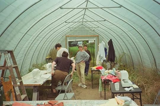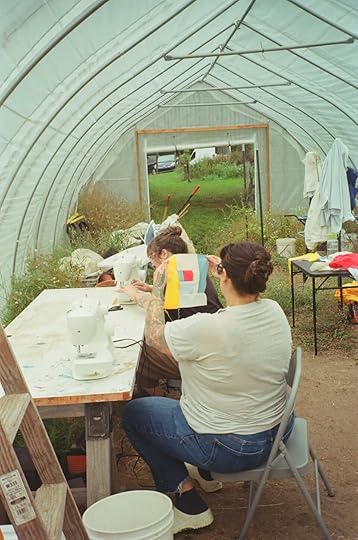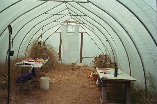 The empty hoop house, never really emptyMe and Ellen brought small generators and long extension cords that allowed for a pop up studio in the old hoop house as it trickled down rain all day. The next day the rest of the team was excited to join the hoop house crew outside and almost everyone had turned an outdoor table into their portable studio. A quilt is something human, a quilt is something a part of the land. A quilt is something a part of the everything.