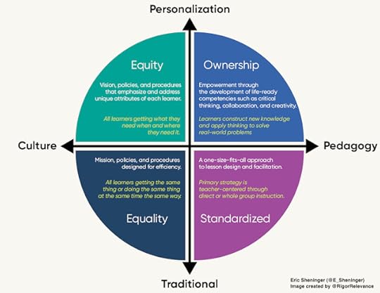 Culture matters. For the students and teacher to thrive, a solid foundation needs to be cultivated where voice, choice, path, pace, and place become ubiquitous elements that are leveraged seamlessly both in and out of the classroom. Examples include flexible schedules, virtual options, learning academies, use of data, and high-functioning PLCs. Here is where leadership is pivotal. An equitable learning culture at the district and school level can only be created through the development of policies, procedures, and vision that result in systems geared toward supporting the uniqueness of all learners. There also must be ongoing professional learning for teachers, coaches, administrators, and other related staff. Traditional systems look to sustain a more equality-based approach.