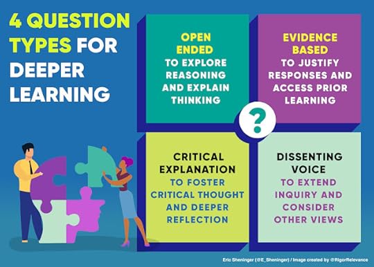 The above synopsis provides some food for thought. Begin by looking at the question stem to determine if it will elicit a one-word response. There is an opportunity to scaffold if it begins with who, what, where, or when. From here, there are numerous opportunities to not only bump up the level of thinking but also foster discourse and build in relevant applications. In Disruptive Thinking in Our Classrooms, I shared four types of questions that can do just that while setting the stage for deeper learning. Below is a summary: