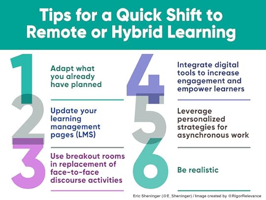 Adapt what you already have planned (don't reinvent the wheel)Update your learning management pages (LMS) such as Canvas, Schoology, or Google Classroom so kids can seamlessly access all assignments and tasksUse breakout rooms in replacement of face-to-face discourse activities Integrate digital tools to increase engagement and empower learnersLeverage personalized strategies for asynchronous work such as choice boards, must-do/may-do, playlists, and flipped lessons.Be realistic (substance over quantity, prioritize standards)