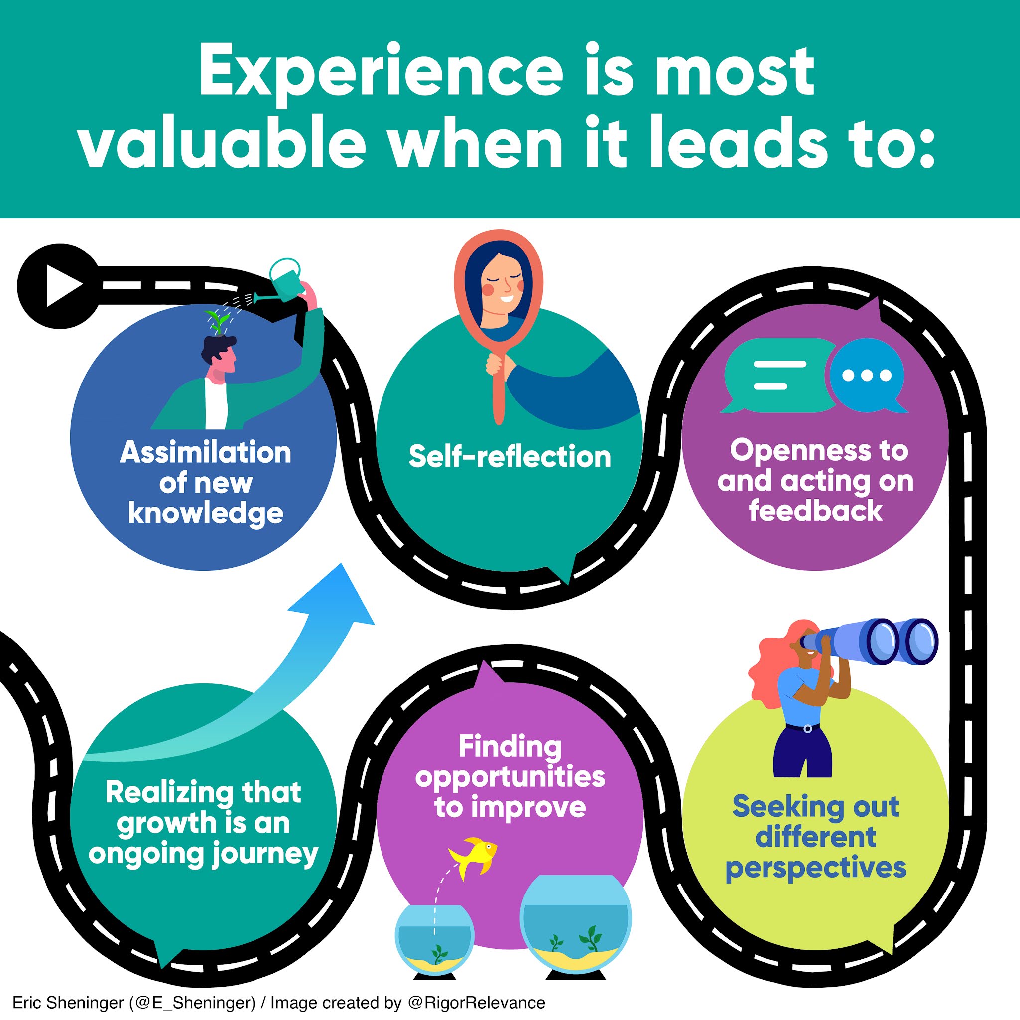 Construction of new knowledgeReflection to improve Openness to and acting on feedback Seeking out different perspectivesRegularly engaging in opportunities to improve Knowing that growth is a never-ending journeyAs the saying goes, experience is the best teacher. This isn’t necessarily true, although it can be if the outcomes listed above are embraced. It is critical that we reflect on our experience and continually grow. Doing something the same way for twenty years doesn’t mean someone is effective. If our practice doesn’t change or improve, then experience doesn’t mean very much.