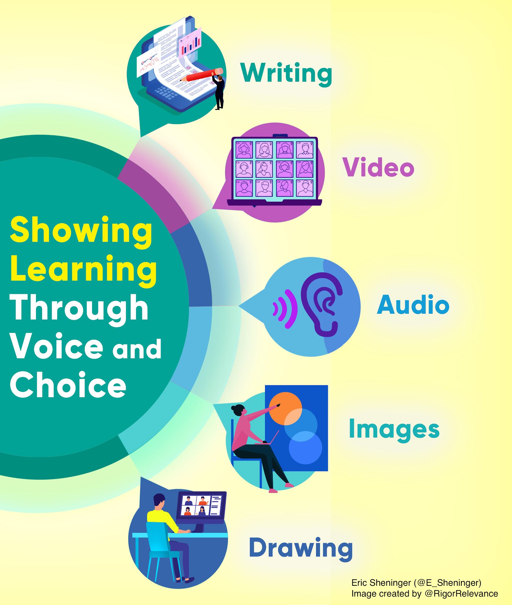 In Disruptive Thinking in Our Classrooms, I laid out an array of personalized strategies that can be implemented after a mini-lesson is facilitated. While these take some planning upfront, there are some simpler techniques that can be readily integrated into any lesson in the form of voice and choice. When reviewing prior learning, checking for understanding, or closing lessons, allow students to choose how to show what they have learned through the following means: