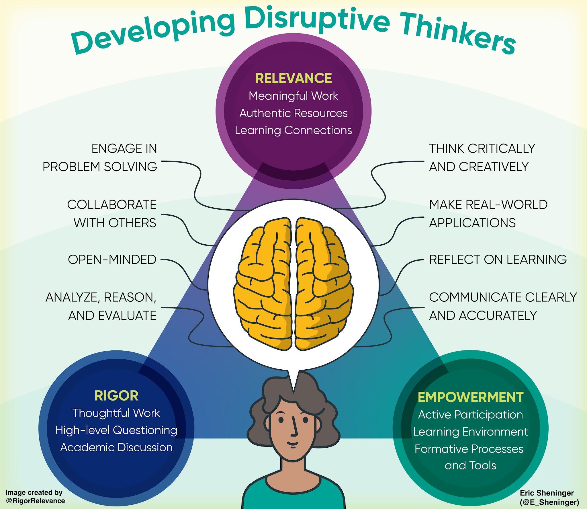 What is really needed for success in the world today? I think this might be the million-dollar question. Even though it is difficult, if not impossible, to predict the future, we can examine current trends and societal forces to determine the competencies that learners need to thrive. While some will remain the same, others will evolve or change completely depending on the disruption at the moment. What I think we can all agree on is that in the face of disruptive forces, conditions in classrooms need to empower learners to replace conventional ideas with innovative solutions to authentic problems. This is how I define disruptive thinking.