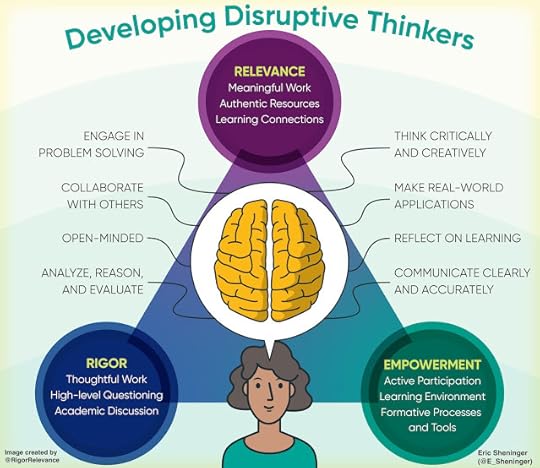 Over time things change. Knowing this compelled me to reflect on how to create a relevant resource that would evolve over time. I have been blogging since the book was published to align updated content, ideas, and strategies to each chapter to deliver on this goal. I have also developed new graphics to support educators as they work to help their learners become disruptive thinkers. To this end, a Pinterest board materialized that is updated regularly. As I learn and reflect through my work in schools, my goal is to keep this link fresh with innovative content.