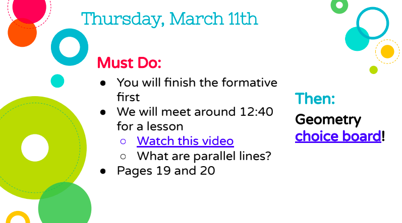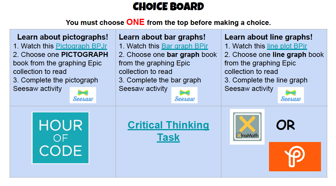 During intercession, some of my students asked if I could bring back the board they could click on as they enjoyed it so much. They said it was easier to follow. So, after spring break, I worked on making a board for my students. They wanted the links so they would not have to click different places. With this board, they know what they have to do daily, weekly, and what to do when they are finished. One thing I do like about the board, I do not hear, "What do I do now?" They are working. Today I asked my first period what they liked about the board, and they said it was easy to follow, plus they love the links.