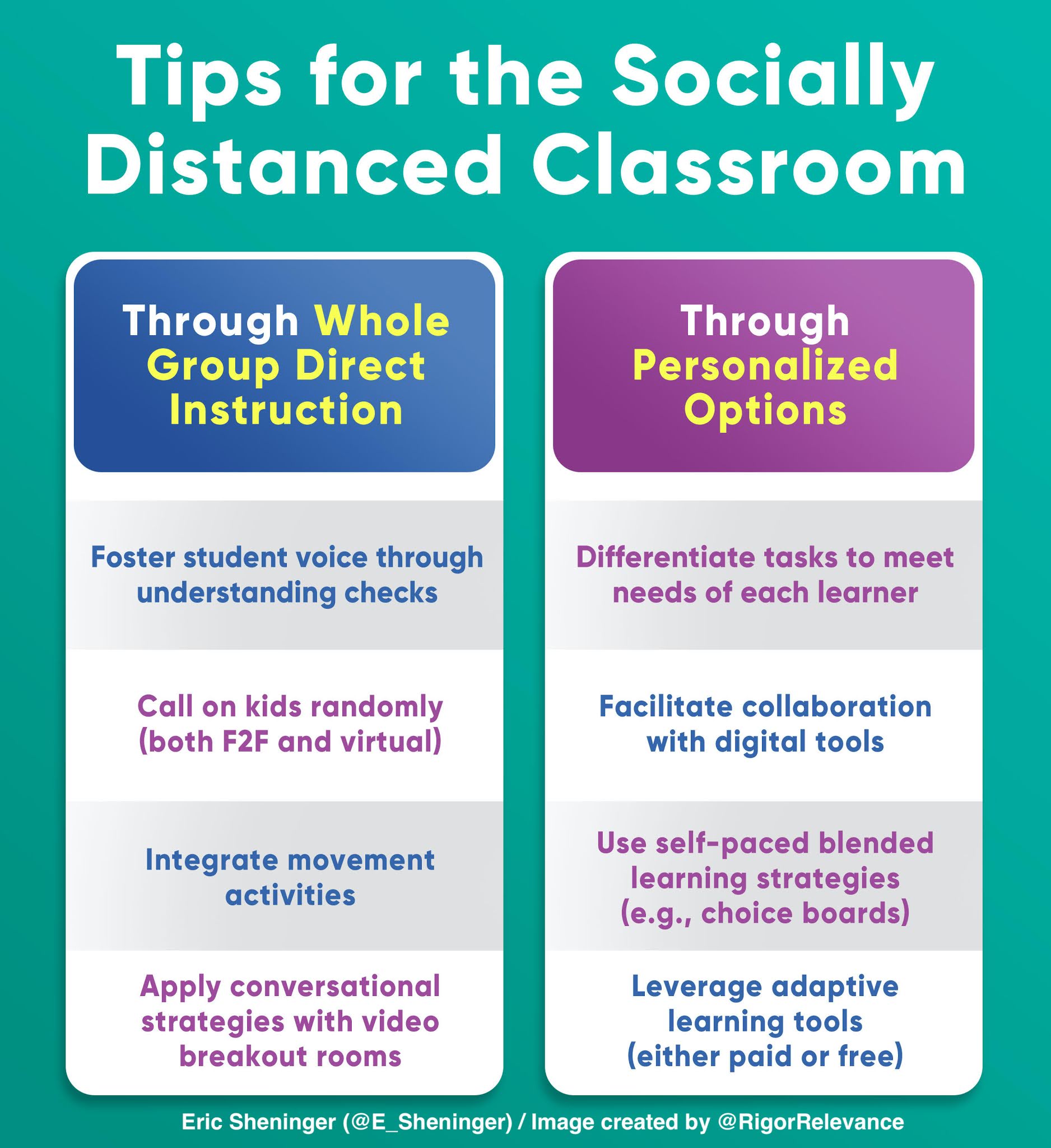 Social distancing does place an added stress on teachers. The good news is that many effective practices that were used before the pandemic have just as much value, if not more, in the current environment. Engaging learners and ensuring they are all actively involved during direct instruction will mitigate off-task behavior while setting the stage for increased motivation. From here, the stage is set to implement some personalized strategies that support various learning modalities and needs.