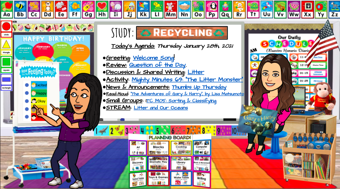 When it was announced that our school district would begin the 2020-2021 school year fully remote, I knew it would be a challenge to engage my Pre-K students remotely while still adhering to developmentally appropriate practices and maintaining fidelity to our curriculum. One day I woke up with the idea that I could convert my physical classroom into a virtual format. As you will see in the Slides that have been shared with you, I've created a virtual classroom that accurately resembles Room #204 of Paterson Public School #28, complete with the same area rug, furniture, and interactive whiteboard. It also features a replica of the Tri-Fold Choice Time "Planning Board" I created last year. Clicking on it will redirect the viewer to an enlarged version of the board, including visual representations of the Interest Areas (or "centers"), which contain images of most of the same toys and materials that can be found in my classroom. The realistic aspect of my virtual classroom was intended to provide my students with a sense of familiarity with the physical classroom that they would hopefully someday enter in person.