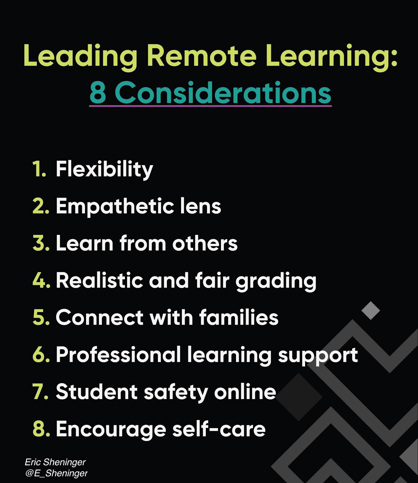 I am sure there are other elements that will be considered. As you map out your plans, keep them generally focused on safety (student and staff) as well as learning. Together we are better and will get through this challenging time.