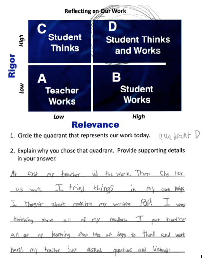 The Framework naturally led to conversations in which students and teachers could both analyze and discuss work produced relative to the four quadrants. Instead of the “right or wrong” paradigm, the conversation shifted to the merits of student work and how it could stretch to other quadrants. Students and teachers were able to think about student achievement as a ladder accessible to everyone.