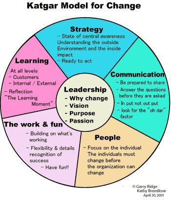 While there is virtually no elaboration that I could find on this model an image provides some detail on the elements that are essential to successful change in any organization. The central tenets of leadership described in this model center on why change is needed. Effective leaders develop a shared vision with input from all stakeholders, including students. They then craft and implement a plan for action that supports the purpose for the change. The glue that holds the entire process together is a leader’s passion for how the change will positively impact students and staff. The Katgar Model for Change then identifies five essential elements that leaders can focus on to ensure success: