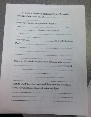 Another key to the success of this lesson was the third scaffold The Cloze Writing Technique (Figure 3). This scaffold provided students with sentence starters gleaned from the student exemplar and allowed them to focus on the content of their arguments without worrying about how to begin. As students struggled to articulate their ideas, they worried that their writing sounded “so simple” and “so elementary.” By helping students articulate their ideas more complexly, Mrs. Montecuollo and Mrs. Westbrook honored each student’s thinking. Thus, students were more willing to take a risk and push themselves from summary to analysis.