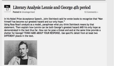 Finally, students posted their pieces to Mrs. Westbrook’s class blog (Figure 4). After posting the students received differentiated feedback to help revise their responses. In addition, the blog is public, so students had a real audience and real responses to reference as they worked to fill gaps in their writing/understanding/learning. In this way, these instructors maximized the learning for all of their students and ensured the class met standard.
