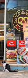 There is a large coloured photograph in the front of the store. This image depicts a mouth-watering looking beefburger with the usual accompaniments, all contained between the two halves of a burger bun topped with sesame seeds. Above the photograph are two words, which would have pleased my beef avoiding, hamburger loving friend: