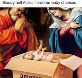 The posting on Facebook showed Joseph and Mary looking at Ababa doll in an opened Amazon delivery package. The caption to the picture was “Bloody hell, Alexa, I ordered baby cheeses”.