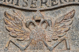 On arrival at the outside (south side) of the church, I spotted a bas-relief carved in stone above the main entrance to the church. It depicts an example of a heraldic creature that has long fascinated me: a double-headed eagle.